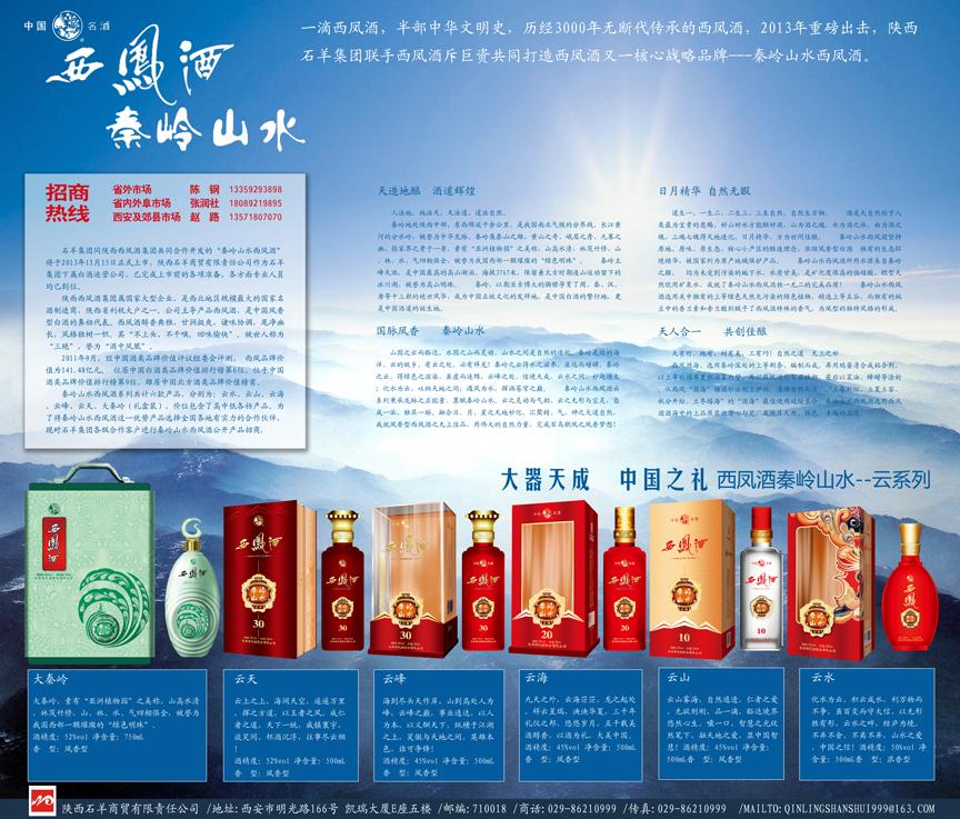 秦岭山水西凤酒系列共计六款产品,分别为:云水、云山、云海、云峰、云天、大秦岭(礼盒装),价位包含了高中低各档产品。为了将秦岭山水西凤酒这一优势产品选择全国各地有实力的合作伙伴,现对石羊集团各级合作客户进行秦岭山水西凤酒公开产品招商,各地有合作意向客户可联系石羊商贸公司以下相关人员。