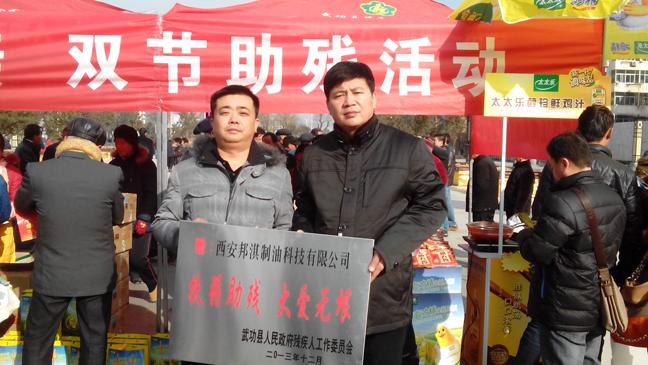 为表达石羊“邦淇人”对武功2.8万残疾人的关爱之情,元月1日到3日,邦淇小包总公司联合武功县残疾人联合会、陕通配送中心在县中心广场联合举办“扶弱助残献爱心、馈赠武功众乡亲”活动,此次活动得到了油脂事业部王晓勇副总经理的大力支持,公司提供邦淇1.8L一豆300余桶、价值5000元,现场给重度残疾人代表免费发放。武功残联理事长秦喜、邦淇小包西区总经理张帆、陕通配送中心经理何凯及市场部有关人员共同参加。张总代表公司发表了热情洋溢致辞,他首先感谢武功父老长期对“邦淇”的支持,然后简要介绍了集团及油脂产业的基本情况,最后表达了对武功残疾人朋友的深切关爱,博得了现场群众的由衷称赞。在热烈的掌声中,残联领导将一面写有“扶弱助残、大爱无垠”的铜牌授予邦淇公司。