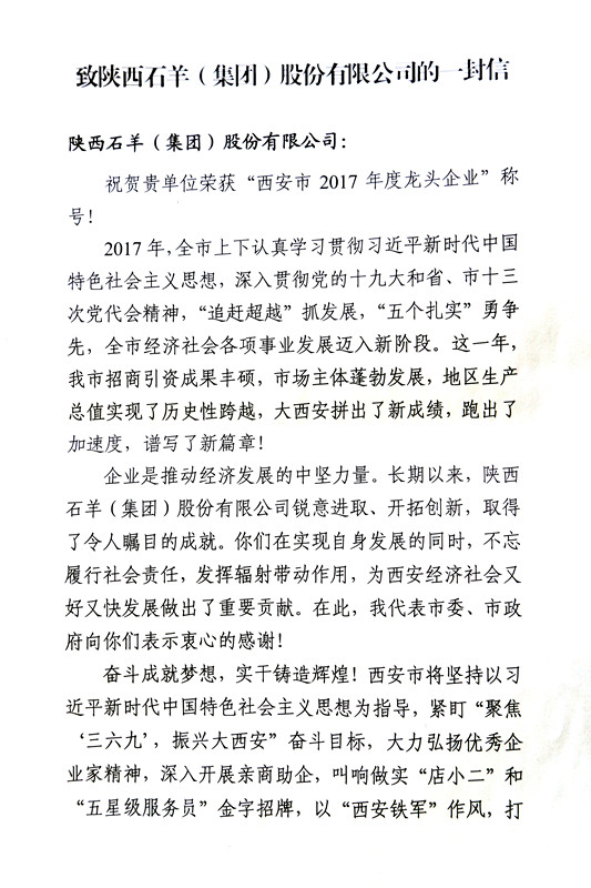 2018年10月10日上午,西安市农业林业委员会组织召开了“西安市农业龙头企业50强授牌仪式暨龙头企业负责人培训会”。会上市农委传达了西安市委书记王永康表彰农业龙头企业50强的批示精神,为西安市农业龙企业50强进行了授牌,并宣读了王永康书记致石羊集团的一封信。
