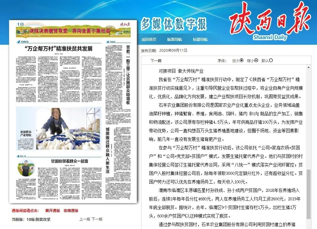 近日,陕西日报、陕西党建网等省级媒体关注并报道石羊集团产业扶贫工作,加深了社会各界对石羊集团的认识,对集团推进脱贫攻坚与乡村振兴工作起到鼓舞和促进作用。