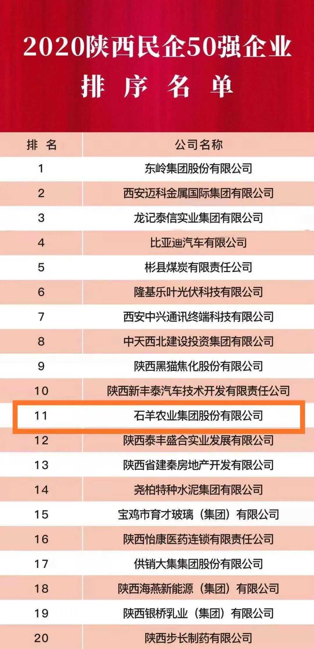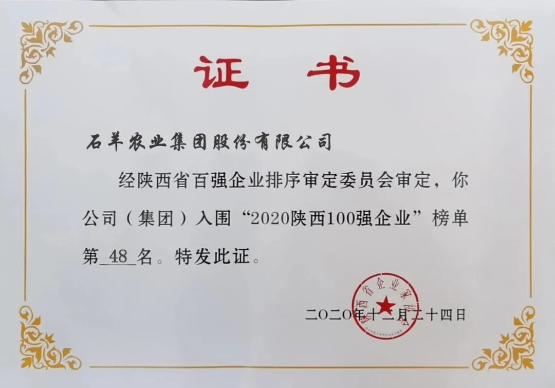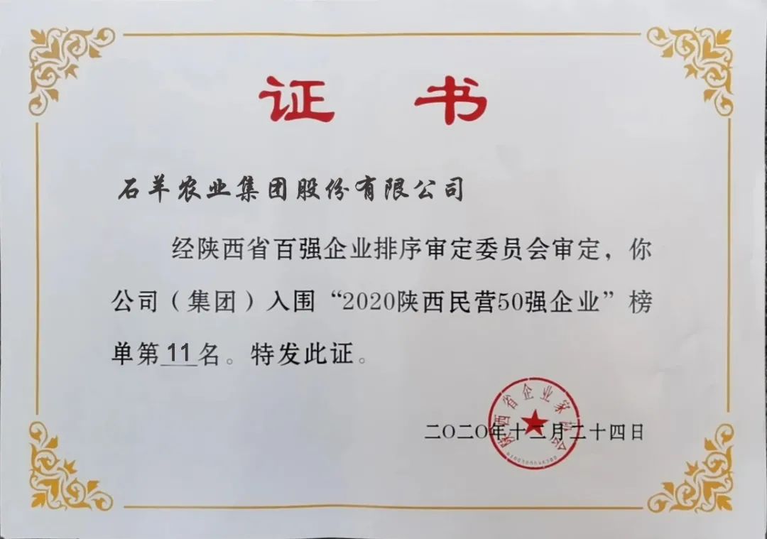 石羊集团荣膺2020年“陕西百强企业”、“陕西民营50强企业”称号,分别排名48位和11位,集团营业收入持续增长。