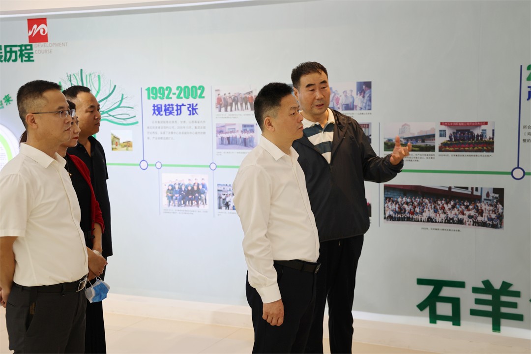 贾强现场听取了石羊集团党委书记、董事长魏存成对企业的概况、发展历程、产业布局和战略定位等情况介绍,了解石羊集团及石羊食品产业园入驻企业的产业链结构、食品安全保障、客户群体等。