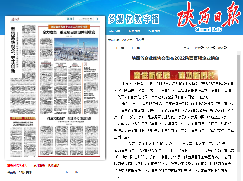 附:陕西百强企业的评选与发布,是在陕西省发改委、工信厅、财政厅、人社厅、商务厅、国资委、统计局、地方金融监管局、省总工会等部门支持下,由省企业家协会牵头,每年开展一次陕西百强企业排序发布工作,受到了省委省政府的高度关注,得到了省级部门、企业界、媒体界等社会各界的普遍欢迎和广泛认可。
