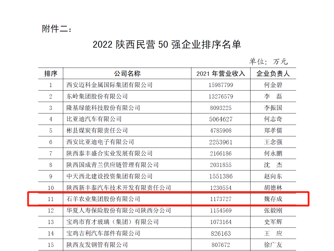 12月18日,由陕西省企业家协会牵头开展的2022年度陕西百强企业排序工作已经顺利完成,并官方公布。石羊集团以年收入117亿元荣登“2022陕西100强企业”榜单第43位,较去年上升2位。