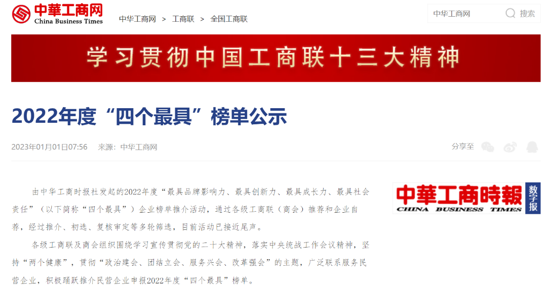 评选榜单经各地方工商联、商会推荐和企业自荐,中华工商时报社“四个最具”推选委员会办公室初选以及推选委员会复核审定产生。“2022最具社会责任企业”榜单从抗击疫情、抗洪救灾、参与“万企帮万村”等方面进行认定。