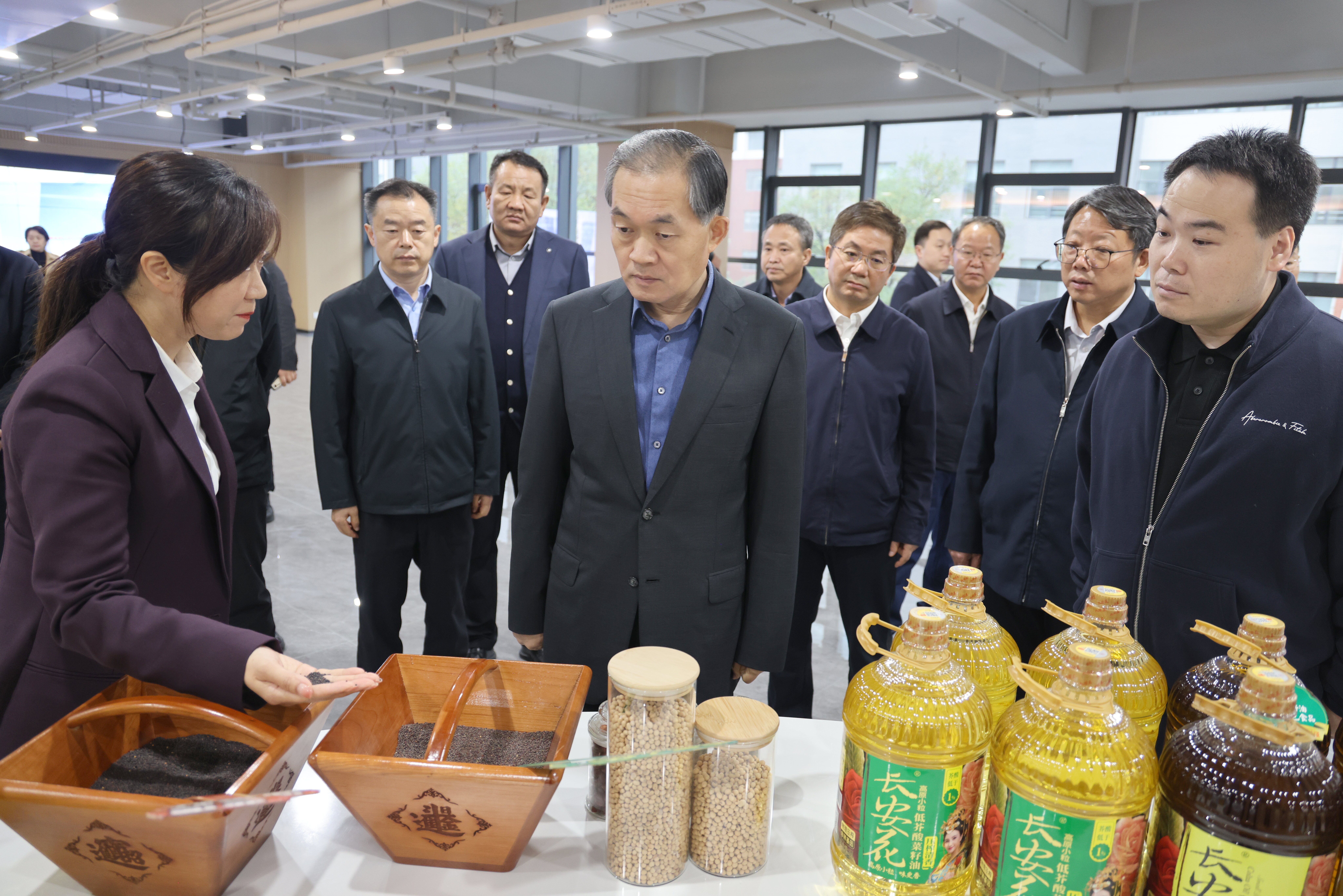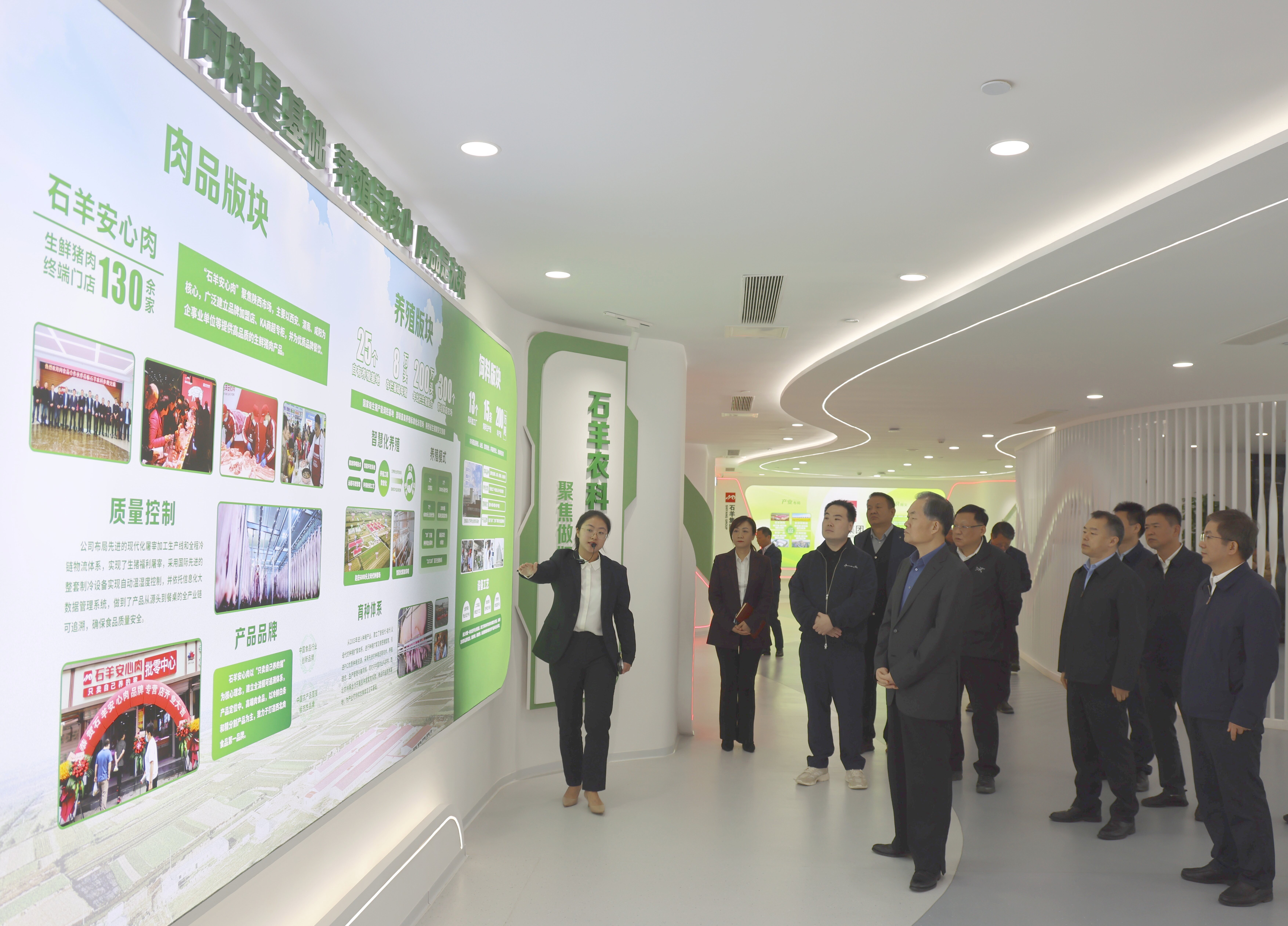 张曙光首先参观了石羊集团展厅,了解企业30多年来的发展历程、产业布局、科技创新与市场拓展等情况。石羊集团总裁魏欢详细介绍了以“一桶油、一块肉、一道菜”为核心的全产业链发展模式和乡村振兴战略中联农、带农的贡献。
